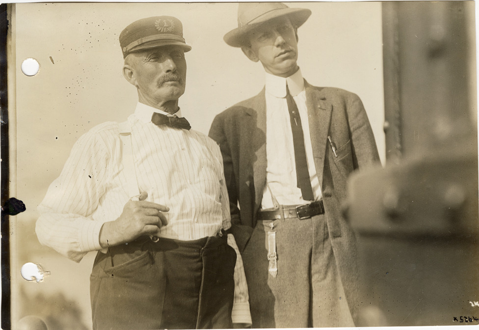 Favorite this☆ Ship captain, 1912 Cadillaqua water fete Description: View of ship captain and an unidentified man during the 1912 Cadillaqua water fete. Handwritten on back: "Capt. boat accomodating Cadillaqua, 1912." Details Resource ID: na050845 Subject: Ship captains--Michigan--Detroit Detroit (Mich.)--Anniversaries, etc. Photographic prints Date Issued: 1912-07 Format: 1 photographic print ; 4.5 x 6.5 in. Member of: National Automotive History Collection Lazarnick Collection Filing Location: Anniversaries--Cadillaqua, 1912, #4 Rights: Physical rights are retained by DPL. Copyright is retained in accordance with U.S. copyright laws.