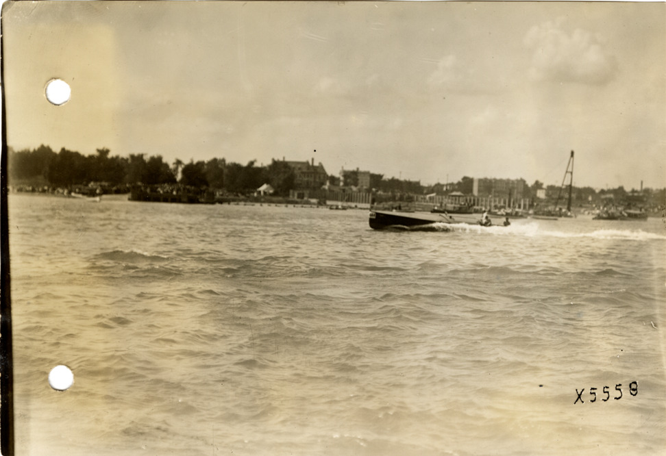 View of the speedboat "Eph" during the 1912 Cadillaqua water fete. Stamped on back: "Spooner & Wells, Inc., photographers, 1231 Woodward Ave., Detroit, Mich., telephone North 1745." Handwritten on back: "The Eph. Cadillaqua, Detroit, 1912."