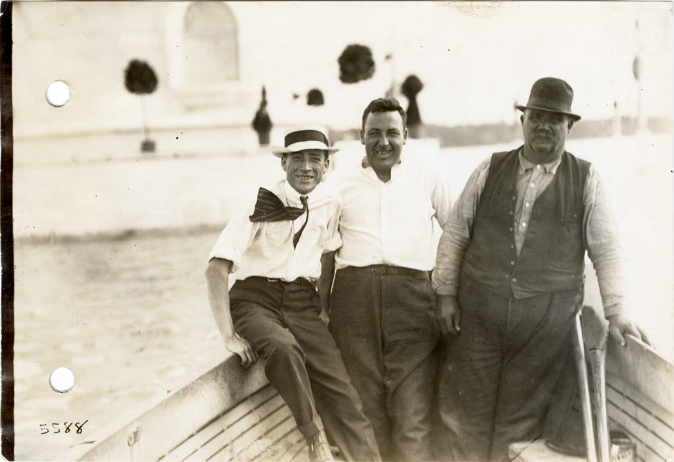 View of three men posing in boat during the 1912 Cadillaqua water fete. Stamped on back: "Spooner & Wells, Inc., photographers, 1231 Woodward Ave., Detroit, Mich., telephone North 1745." Handwritten on back: "Boat used for Cadillaqua celebration, Detroit, 1912."