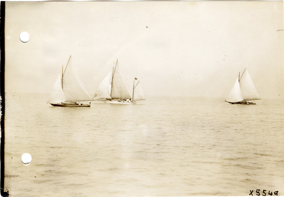 View of sailboats during the 1912 Cadillaqua water fete. Stamped on back: "Spooner & Wells, Inc., photographers, 1231 Woodward Ave., Detroit, Mich., telephone North 1745." Handwritten on back: "Sailboats used for Cadillaqua celebration, Detroit, 1912."