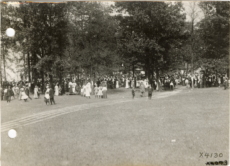 View of crowd at the Michigan State Fair during the visit of President William Howard Taft to Detroit, Michigan. Stamped on back: "Spooner & Wells, Inc., photographers, 1231 Woodward Ave., Detroit, Mich., telephone North 1745." Handwritten on back: "Pres. Taft's visit to Detroit."
