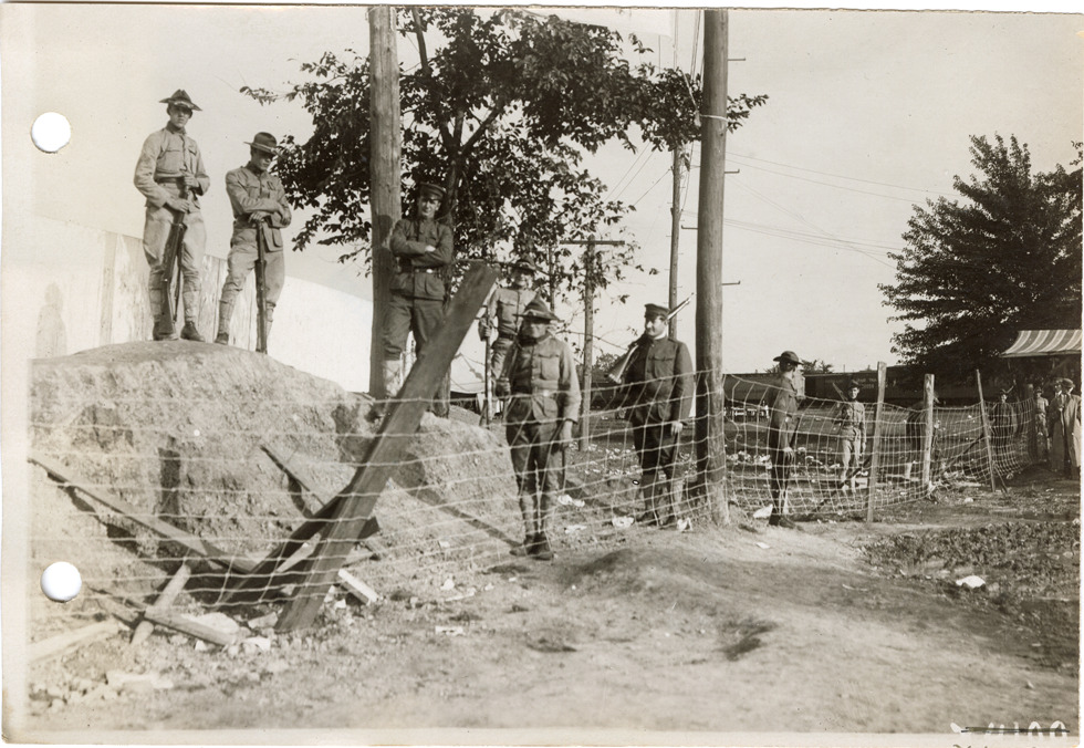 View of soldiers with guns on roadside during the visit of President William Howard Taft to Detroit, Michigan. Stamped on back: "Spooner & Wells, Inc., photographers, 1231 Woodward Ave., Detroit, Mich., telephone North 1745." Handwritten on back: "Pres. Taft's visit to Detroit."