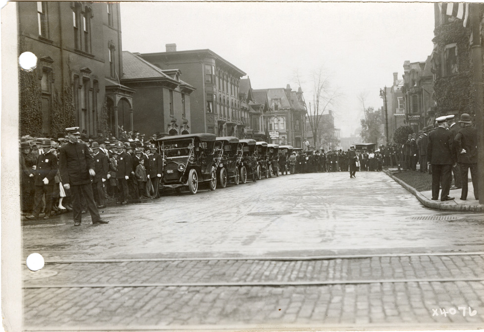View of cars lined up in street and police officers and spectators on sidewalk during the visit of President William Howard Taft to Detroit, Michigan. Stamped on back: "Spooner & Wells, Inc., photographers, 1231 Woodward Ave., Detroit, Mich., telephone North 1745." Handwritten on back: "Pres. Taft in Detroit, Sept. 19, 1911."