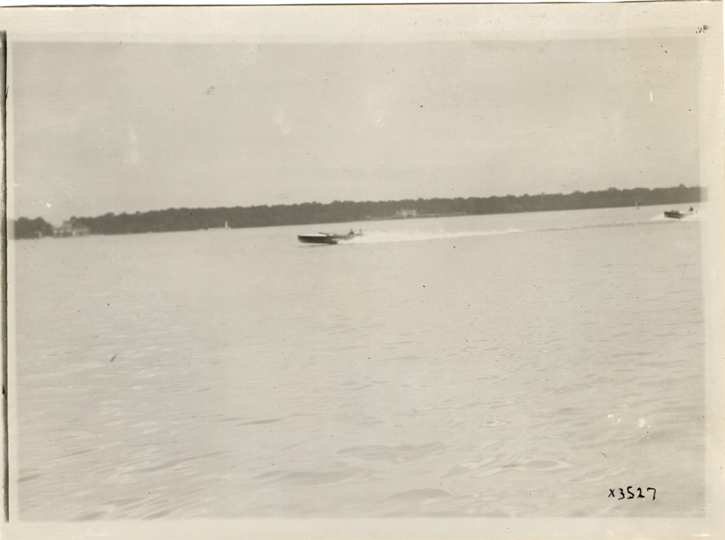 Distant view of driver and passenger in motorboat during the 1911 Great Lakes League Championship on Lake St. Clair.