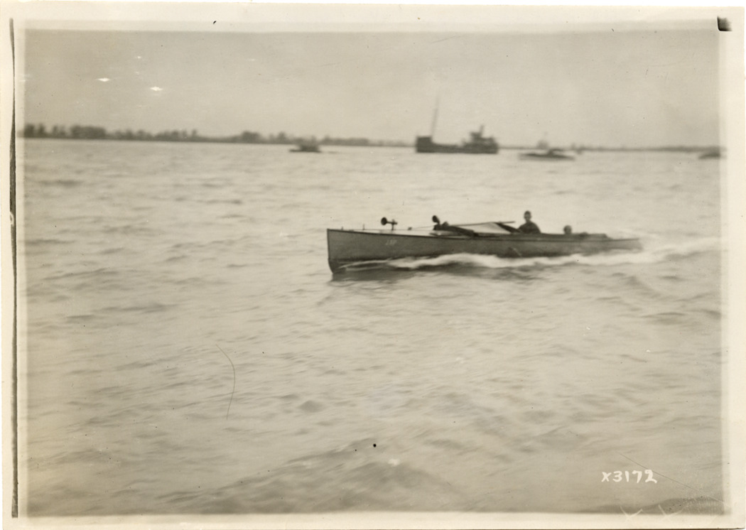 View of driver and passenger in motorboat during the 1911 Great Lakes League Championship on Lake St. Clair.