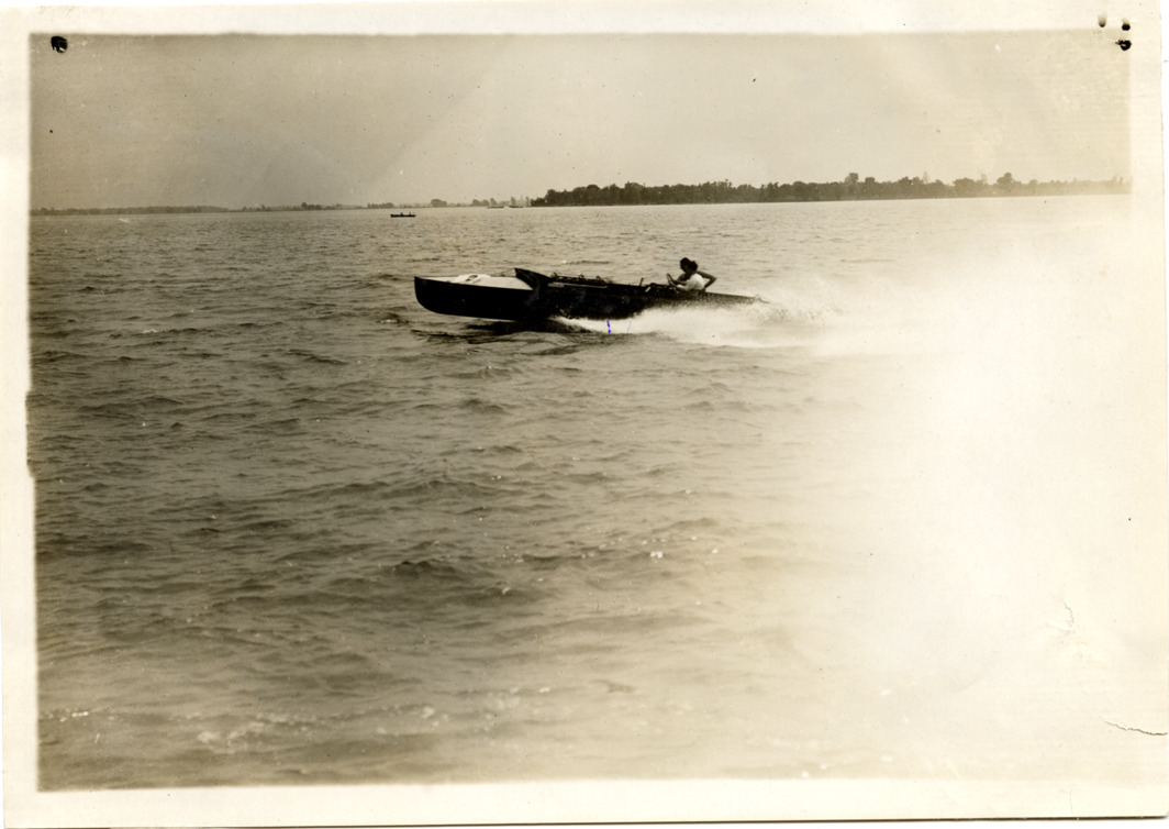Driver and passenger in motorboat, 1911 Great Lakes League Championship