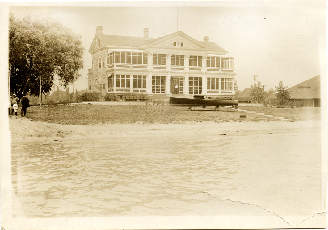 View of the Detroit Motor Boat Club building during the 1911 Great Lakes League Championship on Lake St. Clair. Stamped on back: "Spooner & Wells, Inc., photographers, 1231 Woodward Ave., Detroit, Mich., telephone North 1745." Handwritten on back: "Detroit Boat Club."