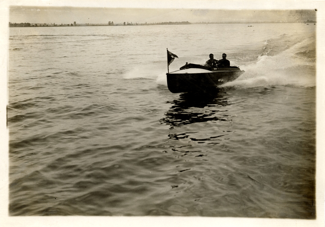 Driver and passenger in motorboat, 1911 Great Lakes League Championship