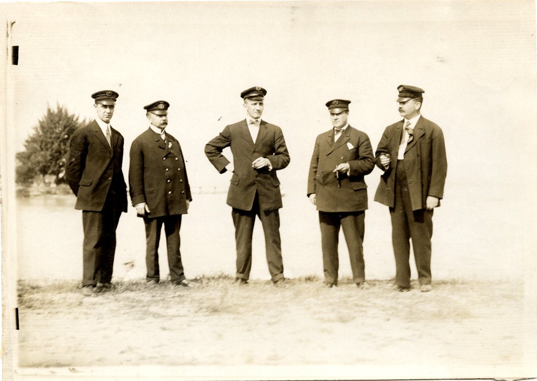 View of the delegation from the Royal Yacht Club in Hamilton, Ontario, during the 1911 Great Lakes League Championship on Lake St. Clair. Stamped on back: "Spooner & Wells, Inc., photographers, 1231 Woodward Ave., Detroit, Mich., telephone North 1745." Handwritten on back: "Delegation from Royal Yacht Club, Hamilton, Ontario. S.A. Brook, Commander John Lennox, J.G. Murphy, Geo. W. [undecipherable], S.B. Beatty."