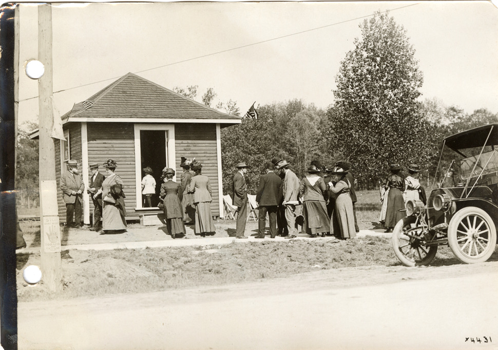 View of men and women waiting outside of wooden-frame building at the site of the State Fair subdivision, Michelson Land & Home Company. Handwritten on back: "Taken at subdivision for Michelson Land & Home Co."
