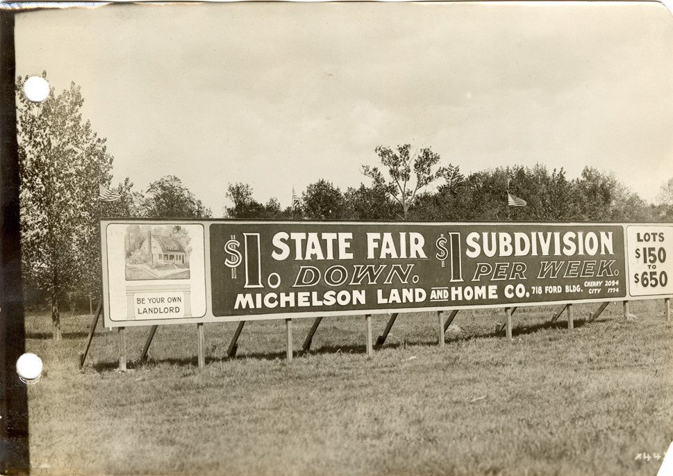View of billboard for State Fair subdivision, Michelson Land & Home Company. Billboard reads: "Be your own landlord. State Fair subdivision, $1 down, $1 per week. Michelson Land and Home Co., 718 Ford Bldg., Cherry 2094, City 1774. Lots $150 to $650." Handwritten on back: "Taken for Michelson Land & Home Co. at subdivision."