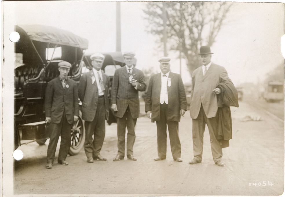 View of five men posing next to automobiles at the Chalmers factory. The Detroit Board of Commerce hosted a delegation from the Upper Peninsula for two days in Detroit. Stamped on back: "Spooner & Wells, Inc., photographers, 1231 Woodward Ave., Detroit, Mich., telephone North 1745." Handwritten on back: "Northerners visit to Detroit, Sept. 1911."
