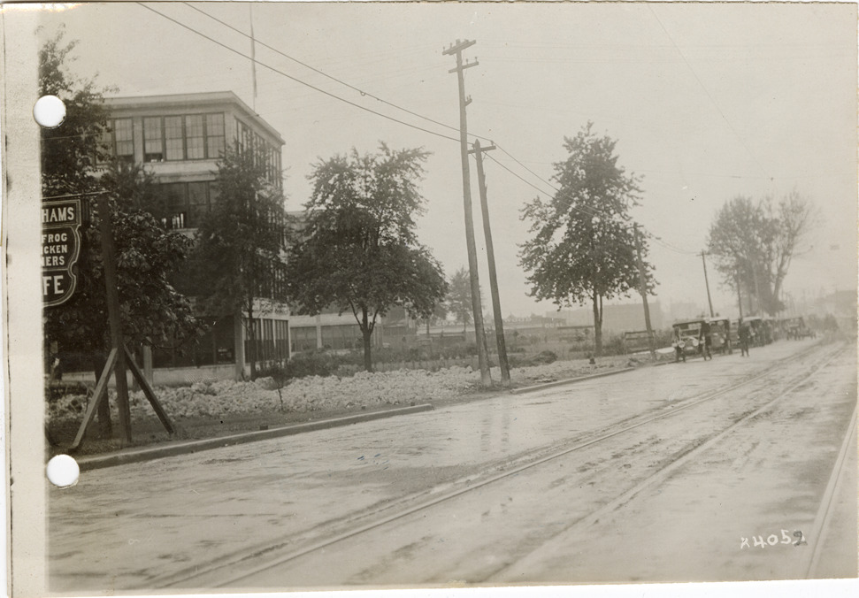 Partial view of the Chalmers factory. The Detroit Board of Commerce hosted a delegation from the Upper Peninsula for two days in Detroit. Several automobiles are parked in road. Stamped on back: "Spooner & Wells, Inc., photographers, 1231 Woodward Ave., Detroit, Mich., telephone North 1745." Handwritten on back: "Northerners visit to Detroit, Sept. 1911."