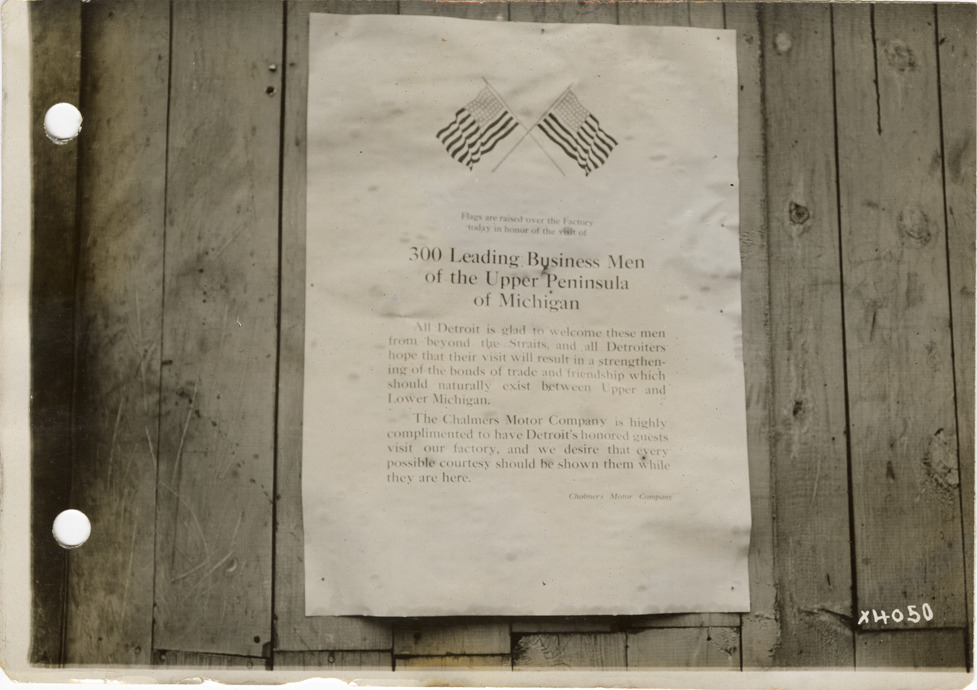 View of a sign at the Chalmers factory, welcoming businessmen from the Upper Peninsula. The Detroit Board of Commerce hosted a delegation from the Upper Peninsula for two days in Detroit. Sign reads: "Flags are raised over the factory today in honor of the visit of 300 leading business men of the Upper Peninsula of Michigan. All Detroit is glad to welcome these men from beyond the Straits and all Detroiters hope that their visit will result in a strengthening of the bonds of trade and friendship which should naturally exist between Upper and Lower Michigan. The Chalmers Motor Company is highly complimented to have Detroit's honored guests visit our factory, and we desire that every possible courtesy should be shown them while they are here. Chalmers Motor Company." Stamped on back: "Spooner & Wells, Inc., photographers, 1231 Woodward Ave., Detroit, Mich., telephone North 1745." Handwritten on back: "Taken during Northerners visit to Detroit, Sept. 1911."