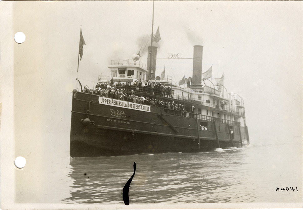 View of delegation from the Upper Peninsula on board the ferry "City of St. Ignace." They were hosted by the Detroit Board of Commerce for two days in Detroit. Banner on ship reads: "Upper Peninsula Booster's Cruise." Stamped on back: "Spooner & Wells, Inc., photographers, 1231 Woodward Ave., Detroit, Mich., telephone North 1745." Handwritten on back: "Northerners visit to Detroit, Sept. 7, 1911."