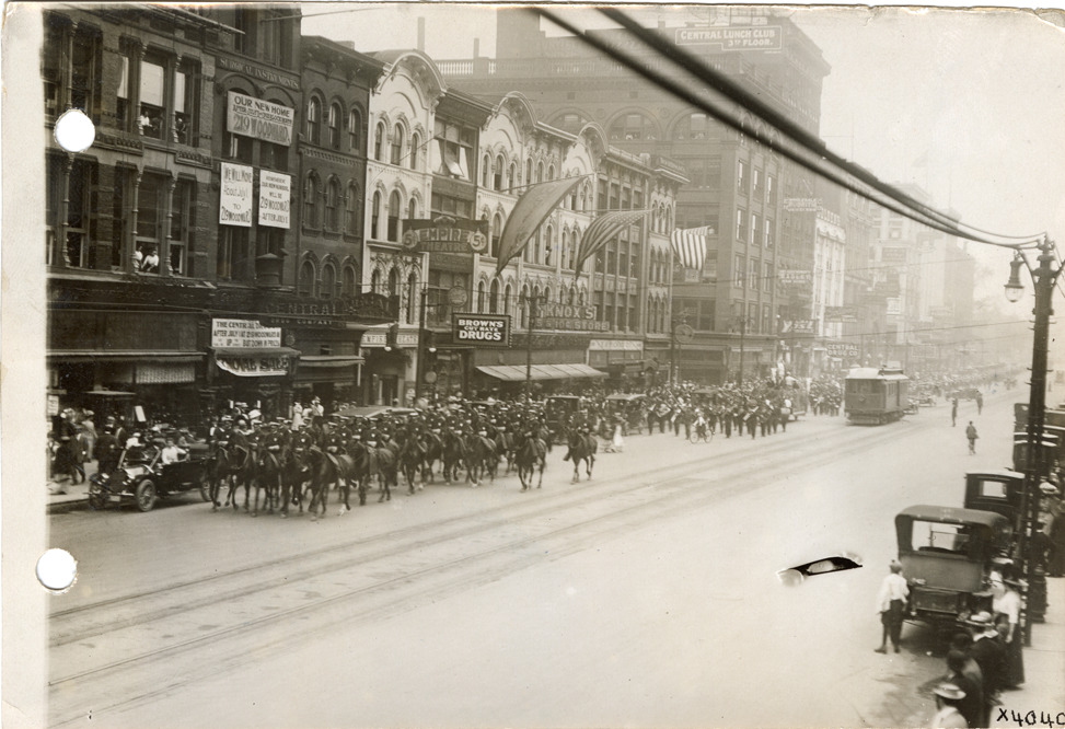View of policemen on horseback and marching band in a parade on Woodward Ave. Commercial buildings in background. The Detroit Board of Commerce hosted a delegation from the Upper Peninsula for two days in Detroit. Stamped on back: "Spooner & Wells, Inc., photographers, 1231 Woodward Ave., Detroit, Mich., telephone North 1745." Handwritten on back: "Northerners visit to Detroit, Sept. 7, 1911."