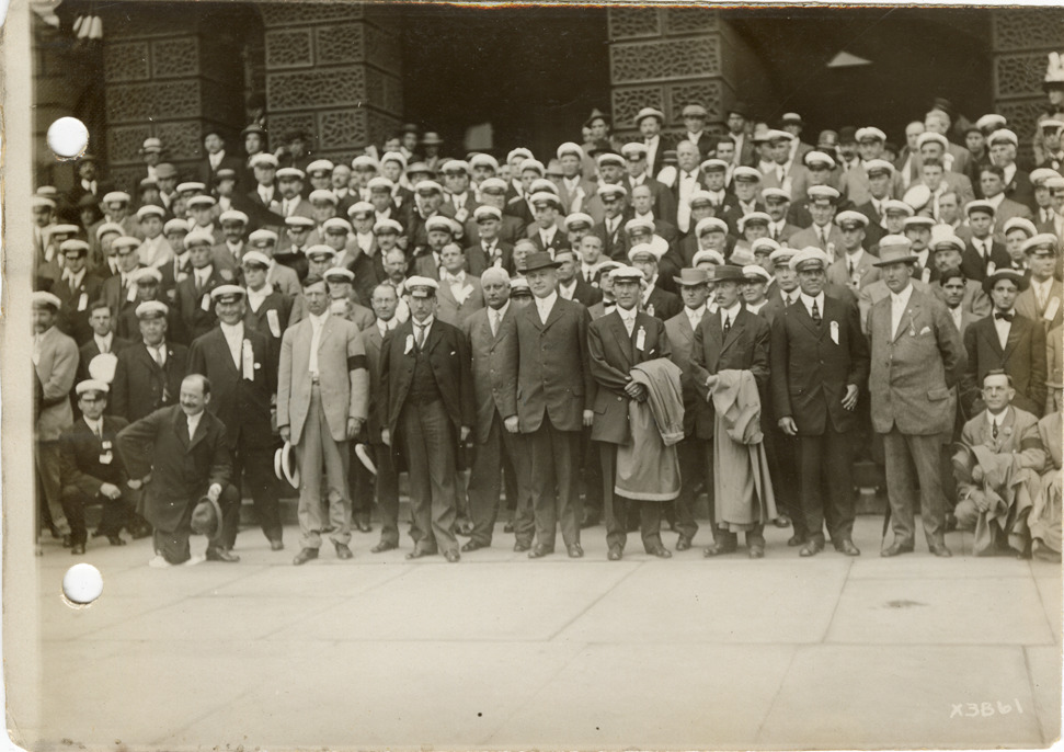 View of businessmen from the Upper Peninsula posing in front of City Hall. The Detroit Board of Commerce hosted a delegation from the Upper Peninsula for two days in Detroit. Stamped on back: "Spooner & Wells, Inc., photographers, 1231 Woodward Ave., Detroit, Mich., telephone North 1745." Handwritten on back: "Northerners visit to Detroit, Sept. 7, 1911."