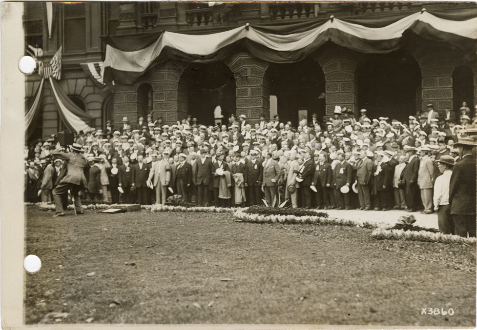 View of businessmen from the Upper Peninsula posing in front of City Hall. The Detroit Board of Commerce hosted a delegation from the Upper Peninsula for two days in Detroit. Stamped on back: "Spooner & Wells, Inc., photographers, 1231 Woodward Ave., Detroit, Mich., telephone North 1745." Handwritten on back: "Northerners visit to Detroit, Sept. 7, 1911."