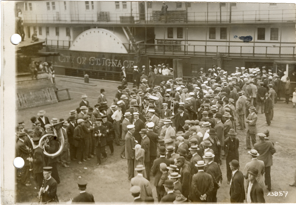 View of delegation from the Upper Peninsula disembarking from the ferry "City of St. Ignace." They were hosted by the Detroit Board of Commerce for two days in Detroit. Marching band is partially visible on left. Stamped on back: "Spooner & Wells, Inc., photographers, 1231 Woodward Ave., Detroit, Mich., telephone North 1745." Handwritten on back: "Northerners visit to Detroit, Sept. 7, 1911."