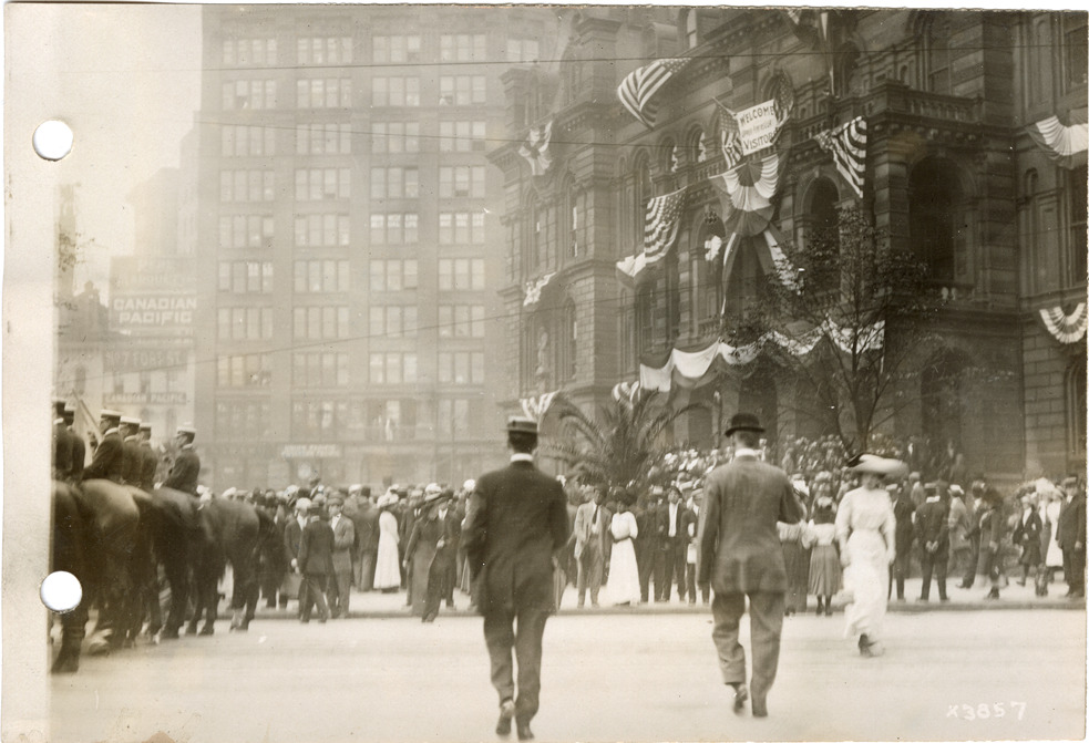 View of City Hall decorated with bunting and flags in honor of the delegation from the Upper Peninsula. They were hosted by the Detroit Board of Commerce for two days in Detroit. Sign on building reads: "Welcome, Upper Peninsula visitors." Crowd in foreground. Stamped on back: "Spooner & Wells, Inc., photographers, 1231 Woodward Ave., Detroit, Mich., telephone North 1745." Handwritten on back: "Northerners visit to Detroit, Sept. 7, 1911."