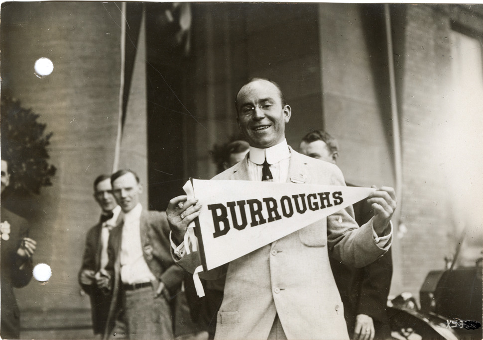 View of a salesman posing with a "Burroughs" pennant during the sales convention at the Burroughs Adding Machine Company. Handwritten on back: "Convention at Burroughs Adding Machine Co., 1912."