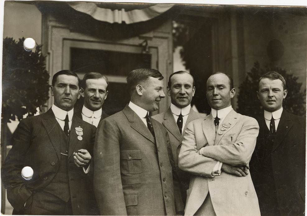 Salesmen posing in front of building, sales convention at Burroughs Adding Machine Company