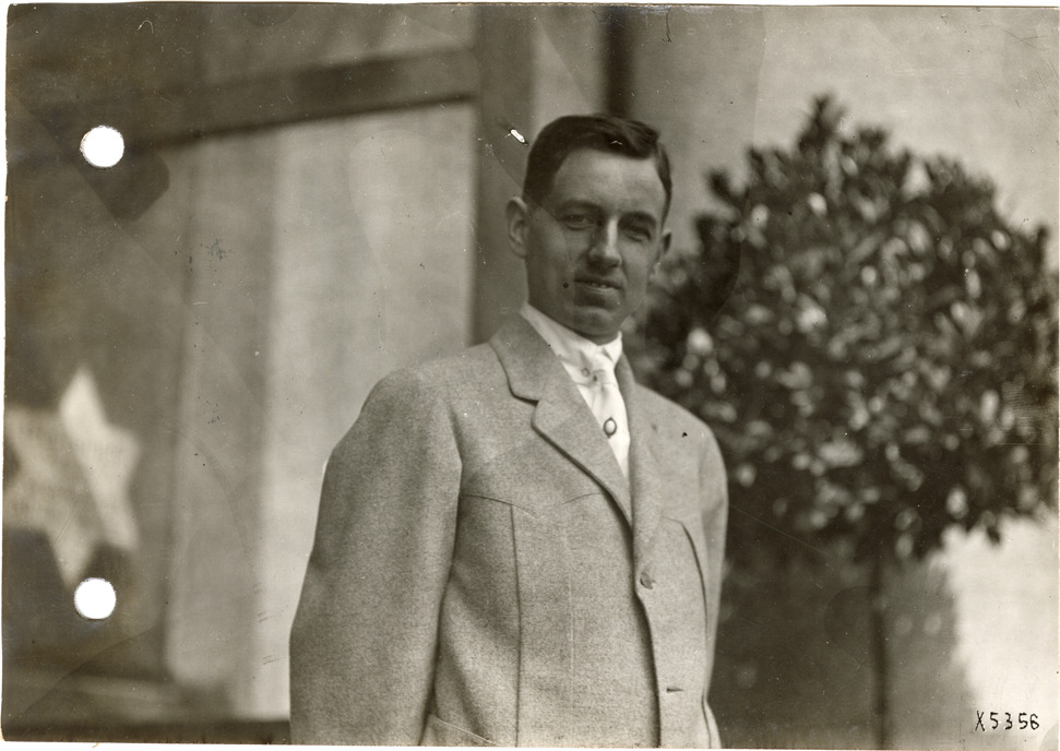 View of salesman posing in front of building during the sales convention at the Burroughs Adding Machine Company. Handwritten on back: "Convention at Burroughs Adding Machine Co., 1912."