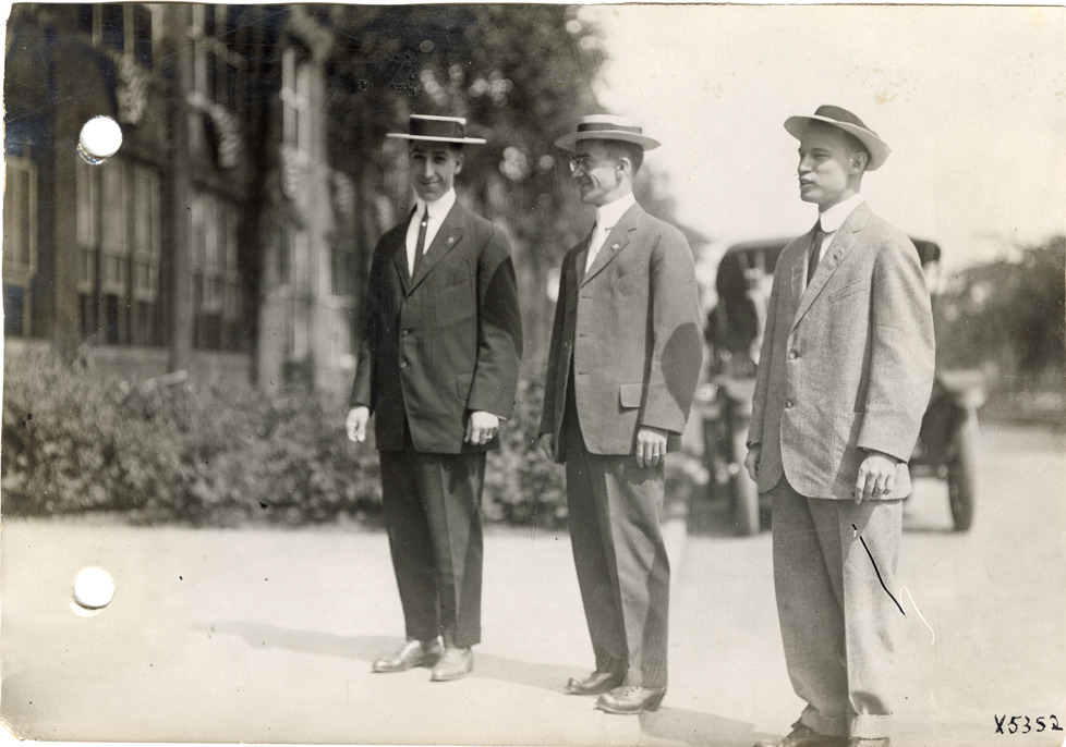 View of three salesmen posing on sidewalk during the sales convention at the Burroughs Adding Machine Company. Handwritten on back: "Convention at Burroughs Adding Machine Co., 1912."