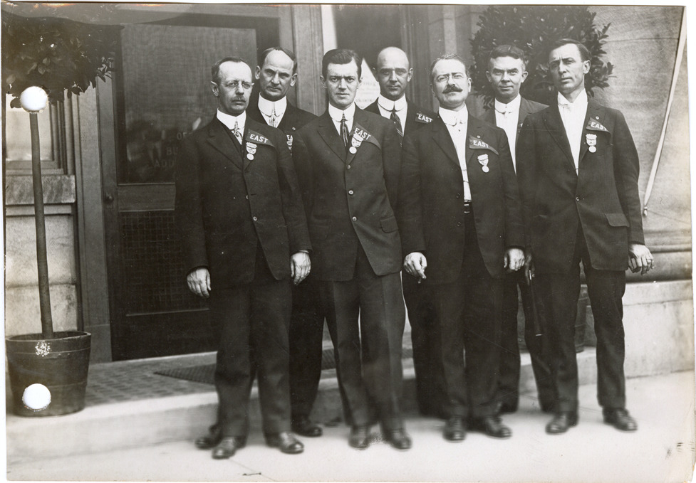 View of several salesmen, wearing "East" badges, posing in front of building during the sales convention at the Burroughs Adding Machine Company. Handwritten on back: "Convention at Burroughs Adding Machine Co., 1912."