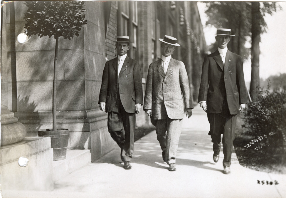 View of three salesmen walking along the sidewalk during the sales convention at the Burroughs Adding Machine Company. Handwritten on back: "Convention at Burroughs Adding Machine Co., 1912."