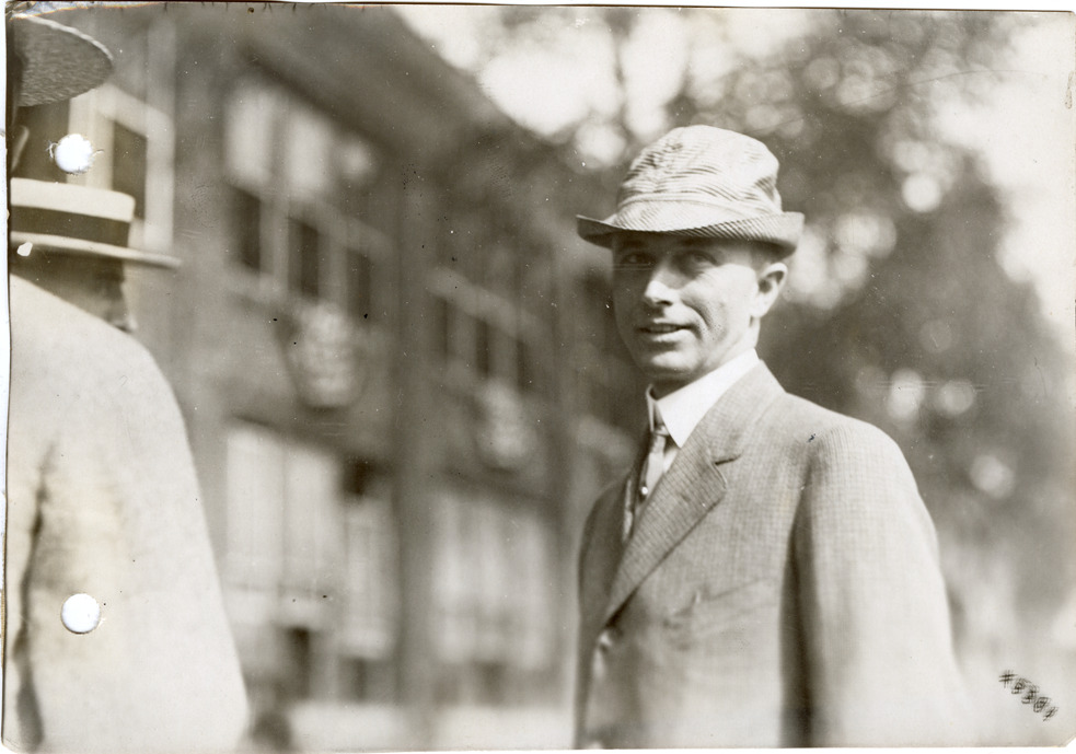 View of salesman posing in front of building during the sales convention at the Burroughs Adding Machine Company. Handwritten on back: "Convention at Burroughs Adding Machine Co., 1912."