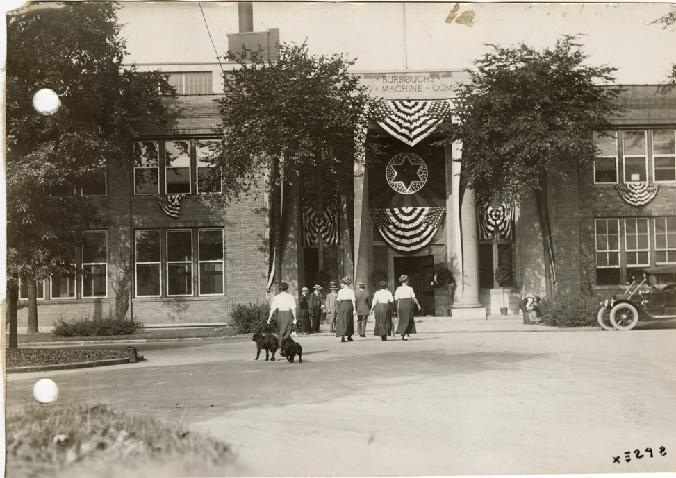 View of the Burroughs Adding Machine Company building decorated for sales convention with bunting and six-pointed star. Group of women, one with two dogs, approach building entrance. Handwritten on back: "Convention at Burroughs Adding Machine Co., 1912."