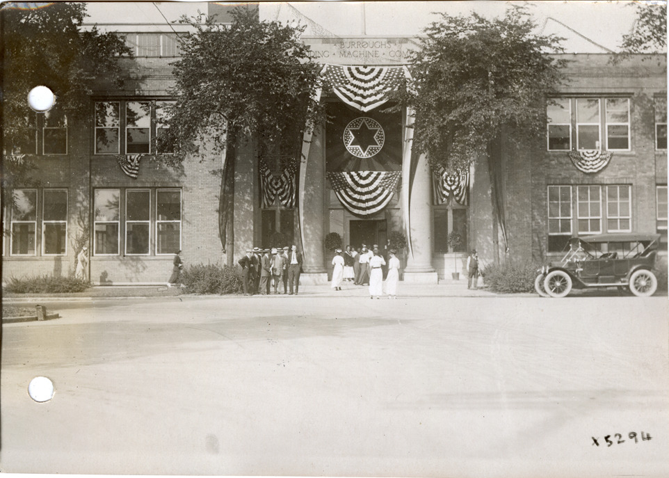 View of the Burroughs Adding Machine Company building decorated for sales convention with bunting and six-pointed star. Men and women stand outside building entrance; automobile on right. Handwritten on back: "Convention at Burroughs Adding Machine Co., 1912."