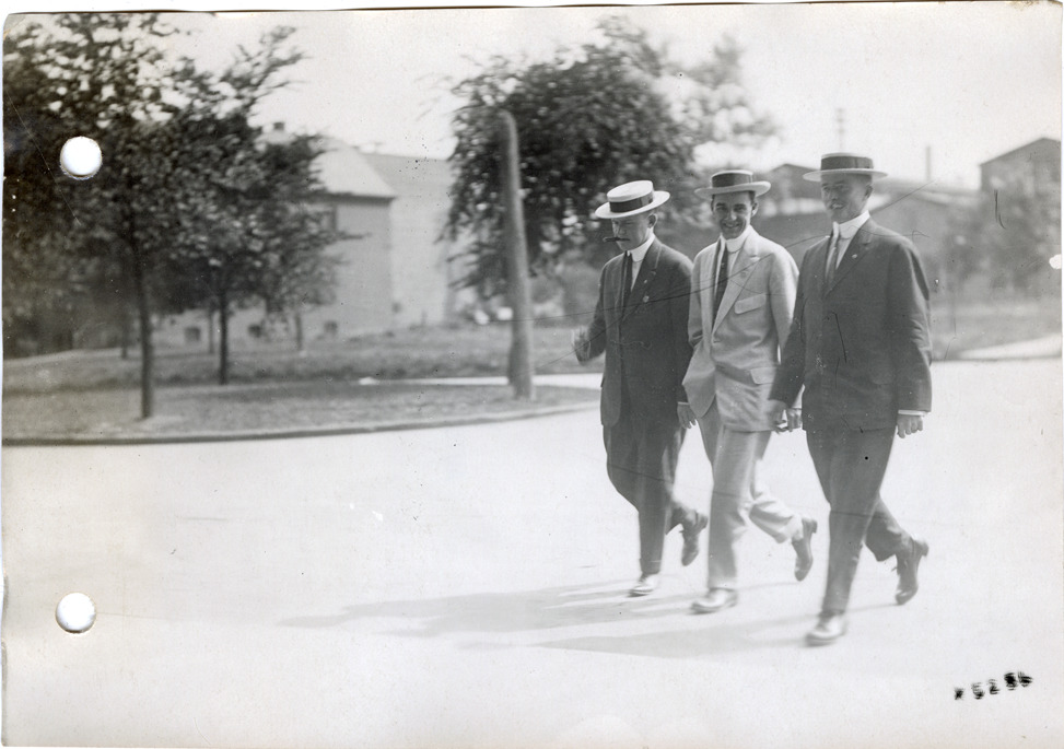 View of three salesmen walking along the sidewalk during the sales convention at the Burroughs Adding Machine Company. Handwritten on back: "Convention at Burroughs Adding Machine Co., 1912."