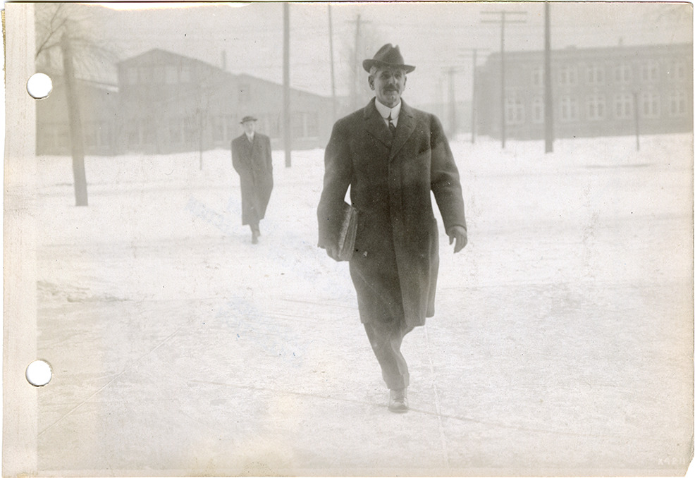View of two salesmen walking in front of the Burroughs Adding Machine Company factory. Stamped on back: "Spooner & Wells, Inc., photographers, 1231 Woodward Ave., Detroit, Mich., telephone North 1745." Handwritten on back: "At Burroughs factory."