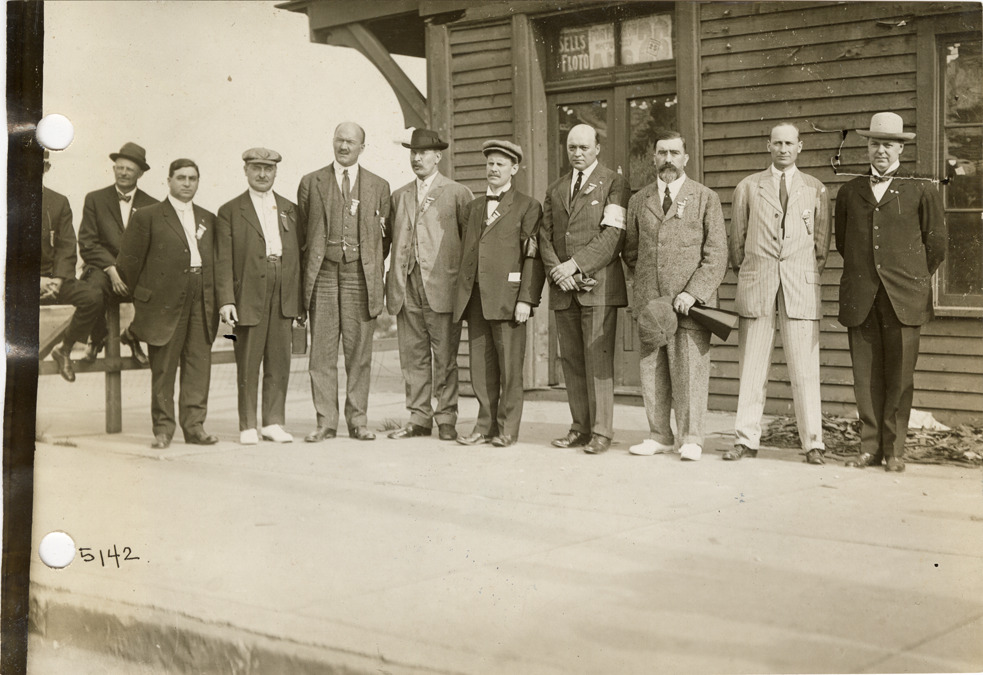 Men posing in front of wooden-frame building, 1912 S.A.E. semi-annual meeting