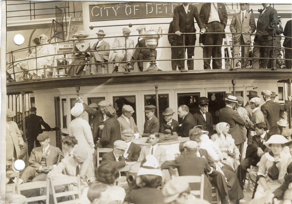 View of men and women on deck of the steamship City of Detroit II during 1912 semi-annual meeting of the S.A.E. Participants traveled from Detroit to Mackinac Island. Handwritten on back: "Events--S.A.E. trip, 1912. Society of Automobile Engineers trip, 1912."