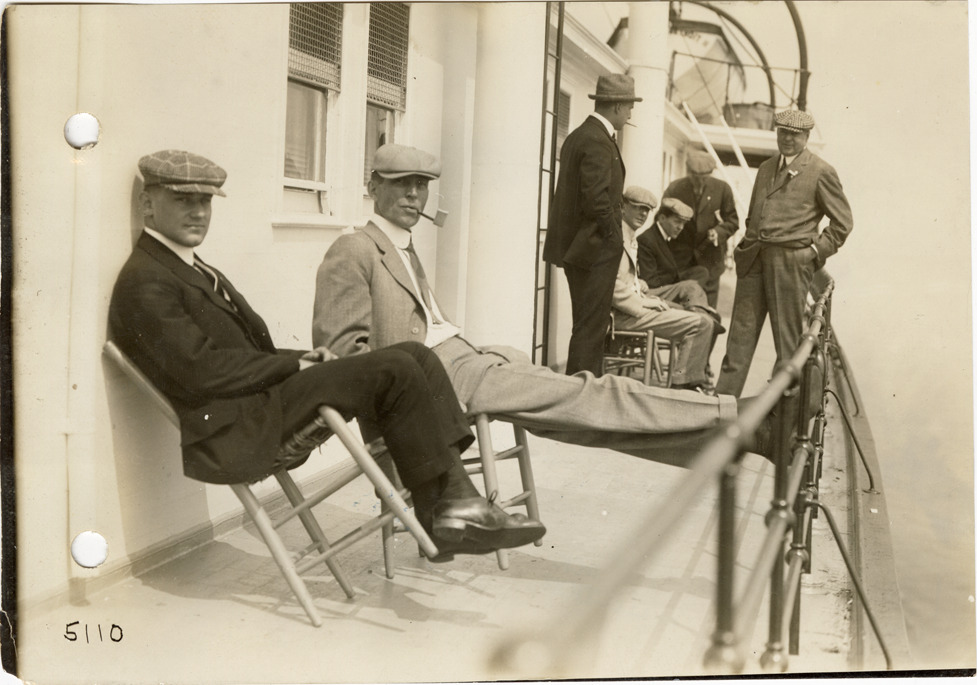 View of men on upper deck of the steamship City of Detroit II during 1912 semi-annual meeting of the S.A.E. Participants traveled from Detroit to Mackinac Island. Stamped on back: "Spooner & Wells, Inc., photographers, 1231 Woodward Ave., Detroit, Mich., telephone North 1745." Handwritten on back: "Events--S.A.E. trip, 1912. Society Automobile Engineers trip, 1912."