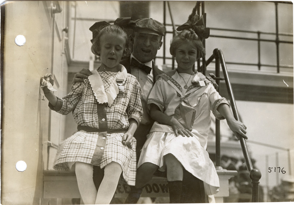 View of a man posing with two girls on deck of the steamship City of Detroit II during 1912 semi-annual meeting of the S.A.E. Participants traveled from Detroit to Mackinac Island. Stamped on back: "Spooner & Wells, Inc., photographers, 1231 Woodward Ave., Detroit, Mich., telephone North 1745." Handwritten on back: "Events--S.A.E. trip, 1912. Society of Automobile Engineers trip, 1912."