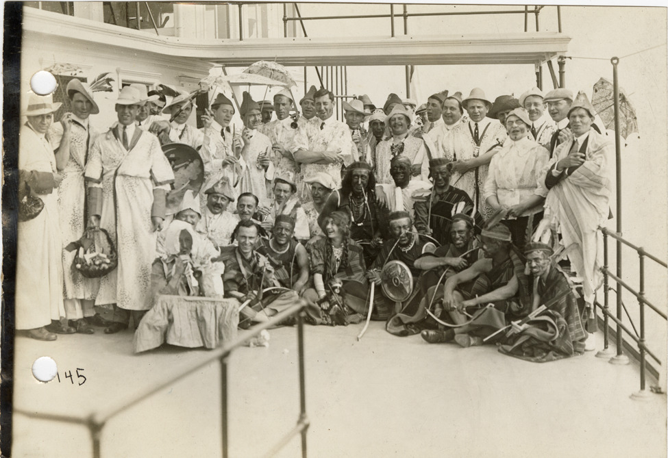 View of men posing in costume on the deck of the steamship City of Detroit II during 1912 semi-annual meeting of the S.A.E. Some men are dressed in women's clothing; others are dressed in American Indian costume. Participants traveled from Detroit to Mackinac Island. Stamped on back: "Spooner & Wells, Inc., photographers, 1231 Woodward Ave., Detroit, Mich., telephone North 1745." Handwritten on back: "Events--S.A.E. trip, 1912. Society Automobile Engineers trip, 1912."