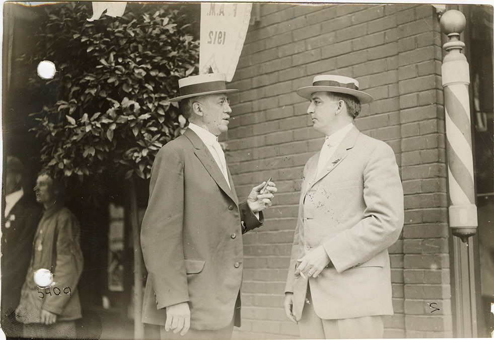 Two men smoking tobacco, 1912 Federation of American Motorcyclists meet