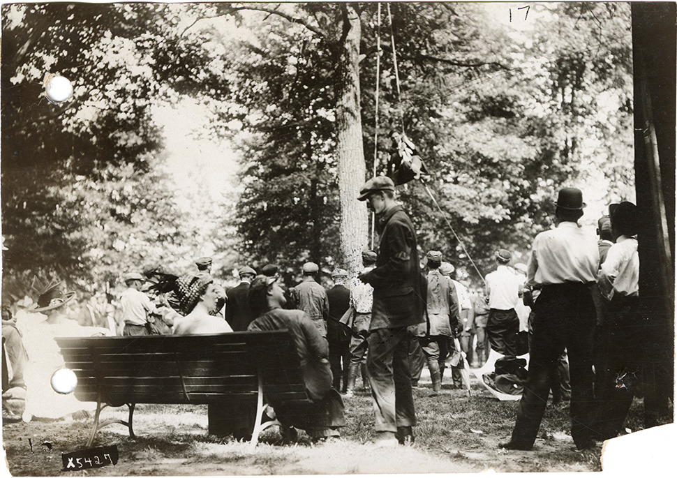 View of men climbing ropes attached to a tree, during the 1912 Federation of American Motorcyclists meet in Columbus, Ohio. Bench in foreground. Handwritten on back: "Federation American Motorcyclists, Columbus, Ohio, 1912."