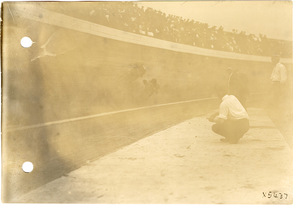 View of motorcyclists racing on track during the 1912 Federation of American Motorcyclists meet in Columbus, Ohio. Man crouches in foreground; spectators in background. Stamped on back: "Spooner & Wells, Inc., photographers, 1231 Woodward Ave., Detroit, Mich., telephone North 1745." Handwritten on back: "Federation American Motorcyclists, Columbus, Ohio, 1912."