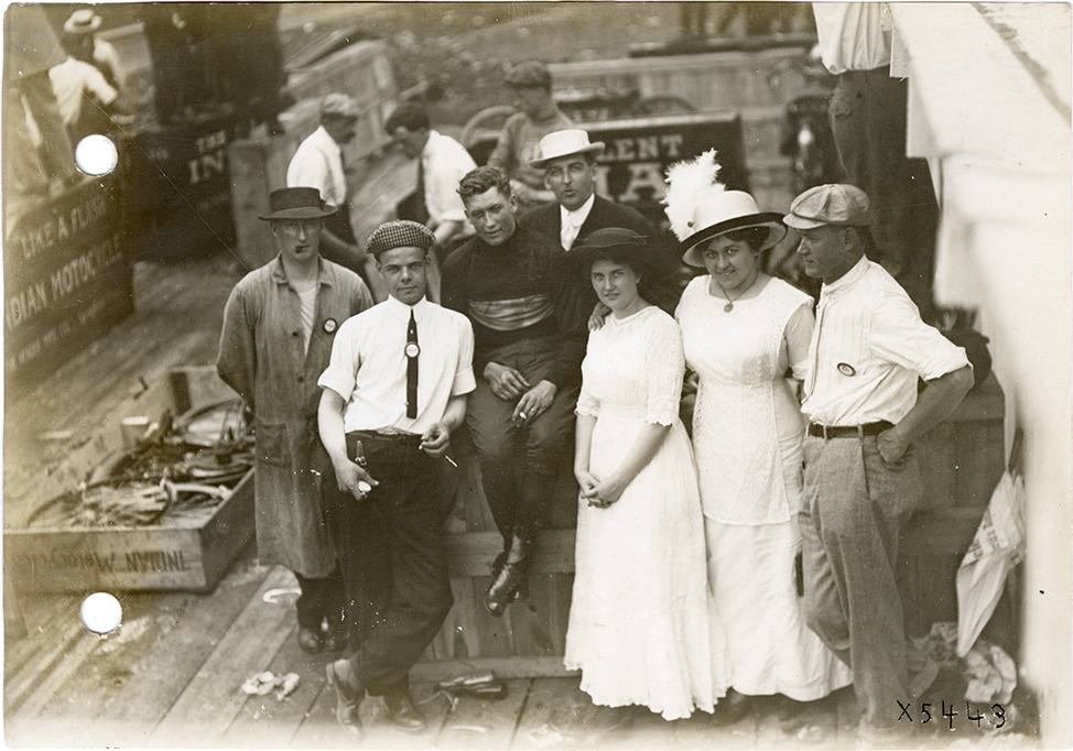 Overhead view of men, women and motorcyclists posing in front of garage during the 1912 Federation of American Motorcyclists meet in Columbus, Ohio. George Squires is second from left. Stamped on back: "Spooner & Wells, Inc., photographers, 1231 Woodward Ave., Detroit, Mich., telephone North 1745." Handwritten on back: "Federation American Motorcyclists, Columbus, Ohio, 1912."