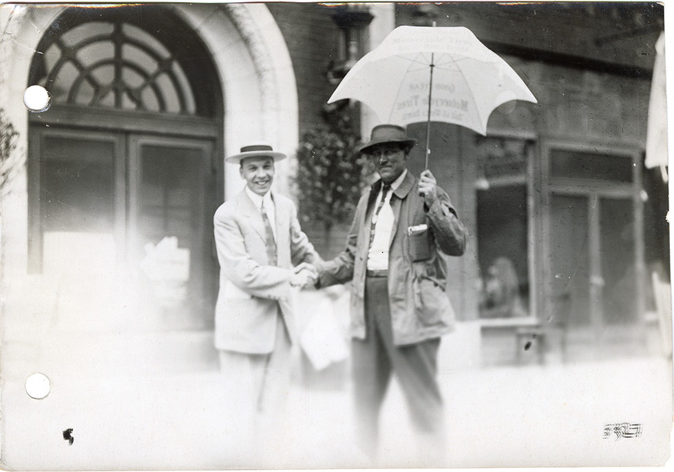 View of two men shaking hands in front of hotel during the 1912 Federation of American Motorcyclists meet in Columbus, Ohio. One man holds an umbrella. Handwritten on back: "Federation of American Motorcyclists, Columbus, Ohio, 1912."