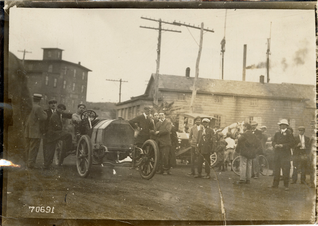 View of driver posing in car, surrounded by onlookers, during the 1911 Algonquin Hill Climb in Algonquin, Illinois. Stamped on back: "Spooner & Wells, Inc., photographers, telephones 3472-3473 Columbus, 1931 Broadway, New York." Handwritten on back: "Hillclimbs--Algonquin, 1911."