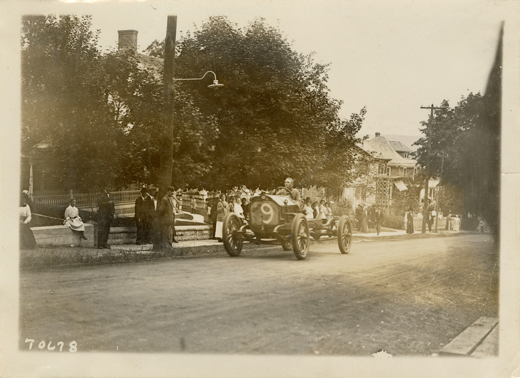 View of Gus Monckmeier racing Staver car no. 9 past spectators on roadside during the 1911 Algonquin Hill Climb in Algonquin, Illinois. Stamped on back: "Spooner & Wells, Inc., photographers, telephones 3472-3473 Columbus, 1931 Broadway, New York." Handwritten on back: "Hillclimbs--Algonquin, 1911."