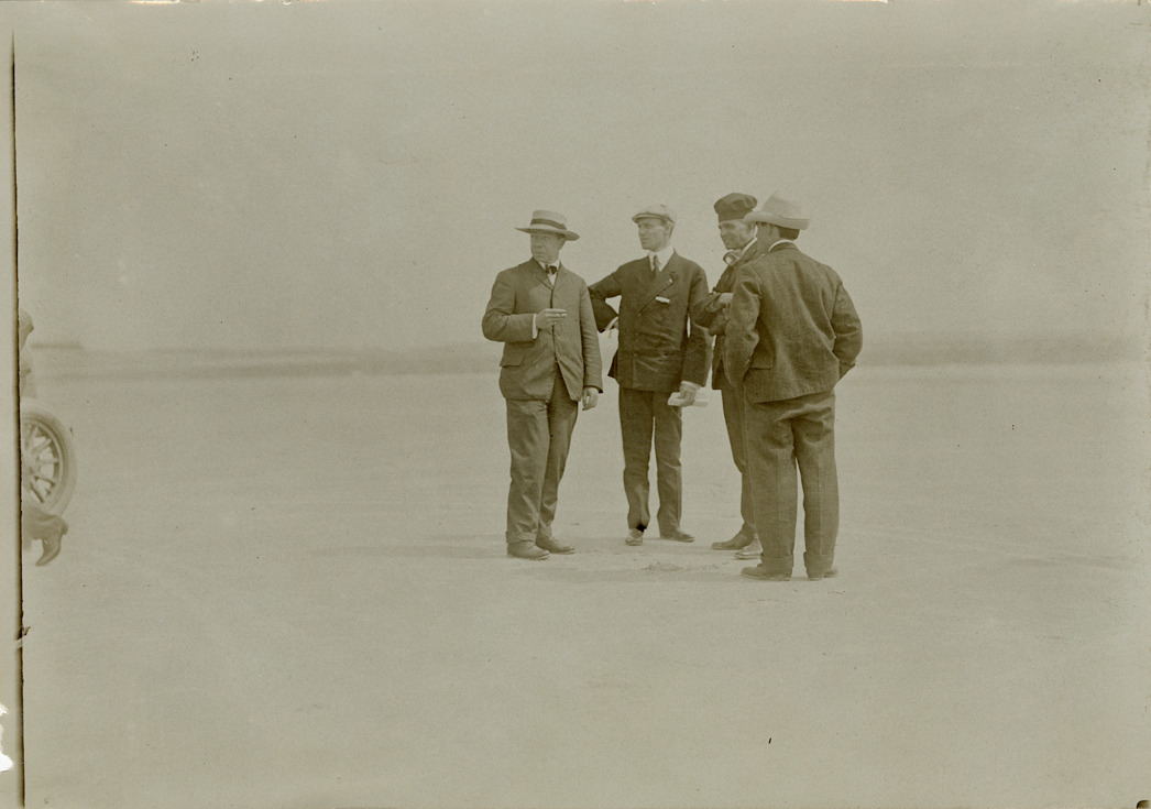 Henry Ford, Gaston Plaintiff and unidentified men, 1905 Cape May Beach races