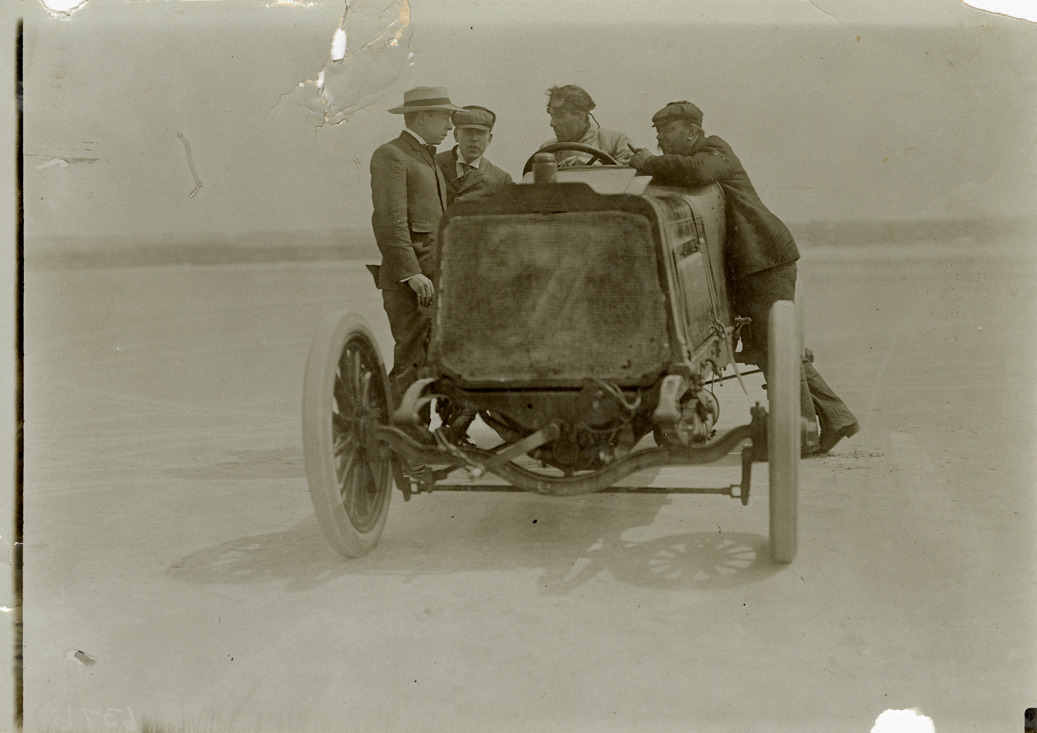 View of A.L. Campbell in Darracq car during the 1905 Cape May Beach races in Cape May, New Jersey. Three men stand next to car. Man on left, wearing a straw hat, is Gaston Plaintiff, Ford New York Branch manager. Stamped on back: "Photo by F. Ed. Spooner, 1536 B'way, telephone 6536-38th St., New York, N.Y." Handwritten on back: "A.L. Campbell, Darracq."