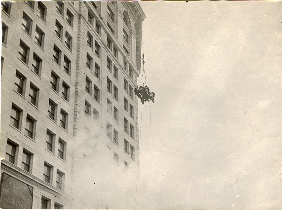 View of a 30 horsepower Kissel Kar runabout being hoisted to the upper levels of the new Fifth Avenue Building in New York, as part of a publicity stunt. Cloud of smoke below. Stamped on back: "Spooner & Wells, Inc., photographers, telephones 3472-3473 Columbus, 1931 Broadway, New York."
